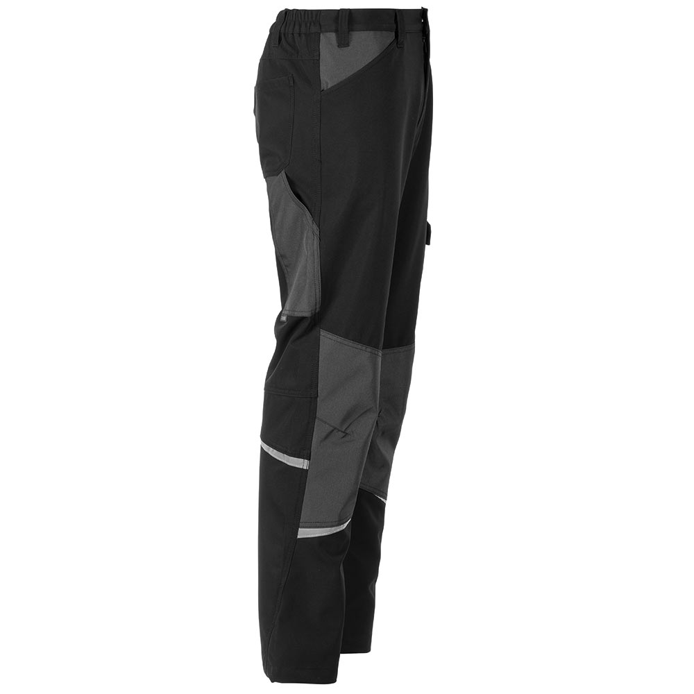 4-Wege Stretchmaterial für maximale Beweglichkeit, 250 g/m² strapazierfähige Polyester Oxford Besätze strapazierfähige, abriebfeste Textilbesätze mit TPU Membrane am Knie atmungsaktiv modische Passform Schlitz mit Reißverschluss zwei seitliche Eingrifftaschen zwei Gesäßtaschen mit Reißverschluß seitliche Tasche mit Reißverschluss Werkzeugschlaufe u. Zollstocktasche mit Balg von oben befüllbare Knieschutztaschen mit Riegel, halten die Kniepolster in optimaler Position und bieten Schutz breite, verstärkte Gürtelschlaufen