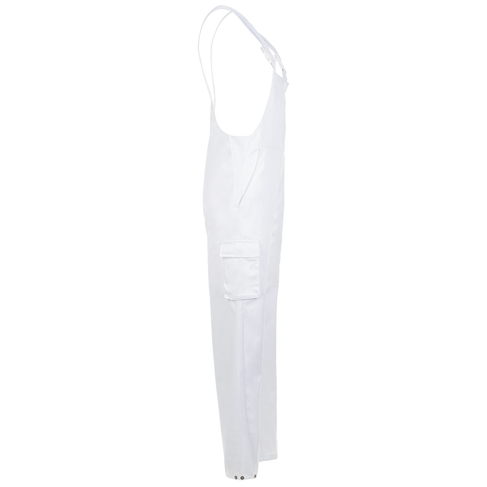 Arbeitshose, Brustlatz mit Tasche innen liegend, 2 eingesetzte Beuteltaschen, mit Patten und Druckknöpfen zu verschließen, 1 Oberschenkeltasche rechts mit Patte und Druckknopf, elastische Einsätze an den Seiten, Sicherheitsschnallen an den Trägern, Fußweite mit Druckknopf zu verstellen